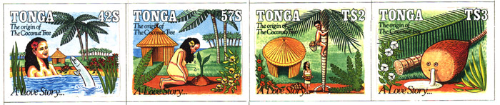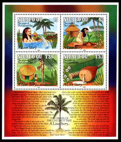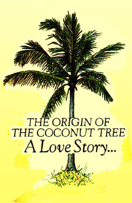 After a few weeks a green shoot peeked through the tear-soaked soil. It was at this time that Heina realised she was pregnant to the eel. As the plant grew, so did the child within her. The child that Heina bore was a son and the plant grew taller and became the first Coconut Palm. As the boy grew, he learned to climb the Coconut tree. He became expert at climbing the tree and bringing down the nuts from the very top. Heina knew instinctively that this strange tree would be of use to I her people. She learnt to de-husk the coconuts and found that every part of the tree was of great value in daily life. The fronds would make a roof or a basket to carry food. The trunk made the poles for houses or wood for the fires. In fact the tree had uses in every way.